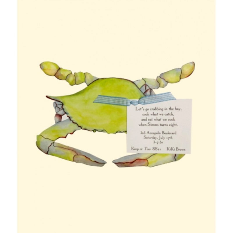 Your beach party or dinner occasion will be a hit when this large high quality invitations and announcement die-cut blue crab cards brings the news. Event details are on a white card that ties on with a blue check ribbon. Blue Crab Invitation one of the selection of Sarah LeClere Invitations.