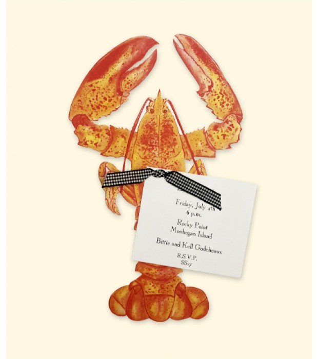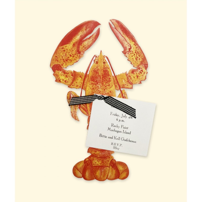 Ideal for a dinner party, rehearsal dinners, backyard lobster bake or beach party. This large lobster die-cut in vibrant colors of orange and red comes with a white card for all the event details. Card ties on with black or navy gingham ribbon. Also used for wedding invites or after parties.